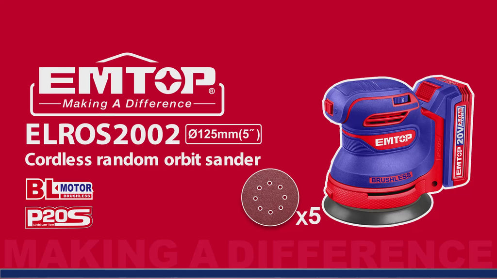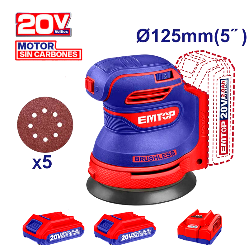 Lijadora roto orbital inalámbrica de 5 plgs con 2 baterías y cargador Emtop ELROS2002