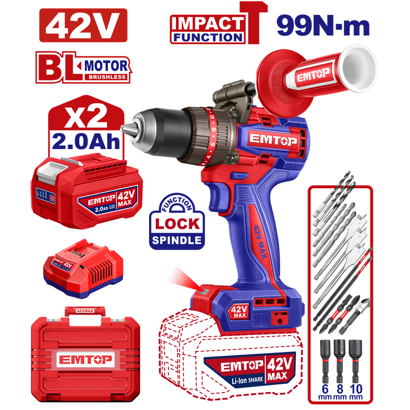 Barreno percutor inalámbrico de 42 voltios, 99 NM, Emtop, ULCIDL429982