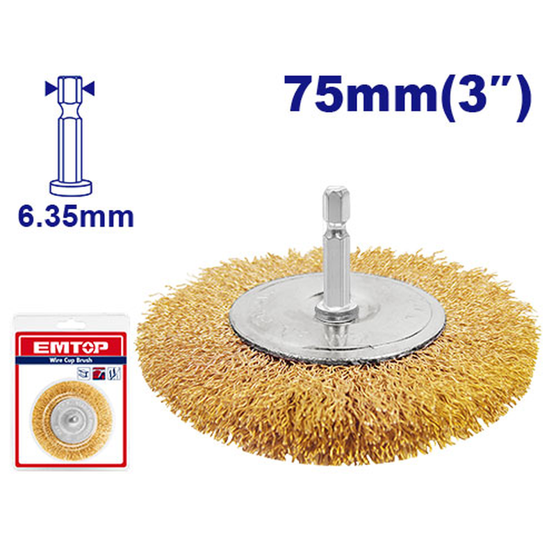 CEPILLO DE ALAMBRE RADIAL DIAMETRO 3 PULGADAS. VASTAGO 1/4. MAXIMA REVOLUCION 4500 RPM. EMTOP