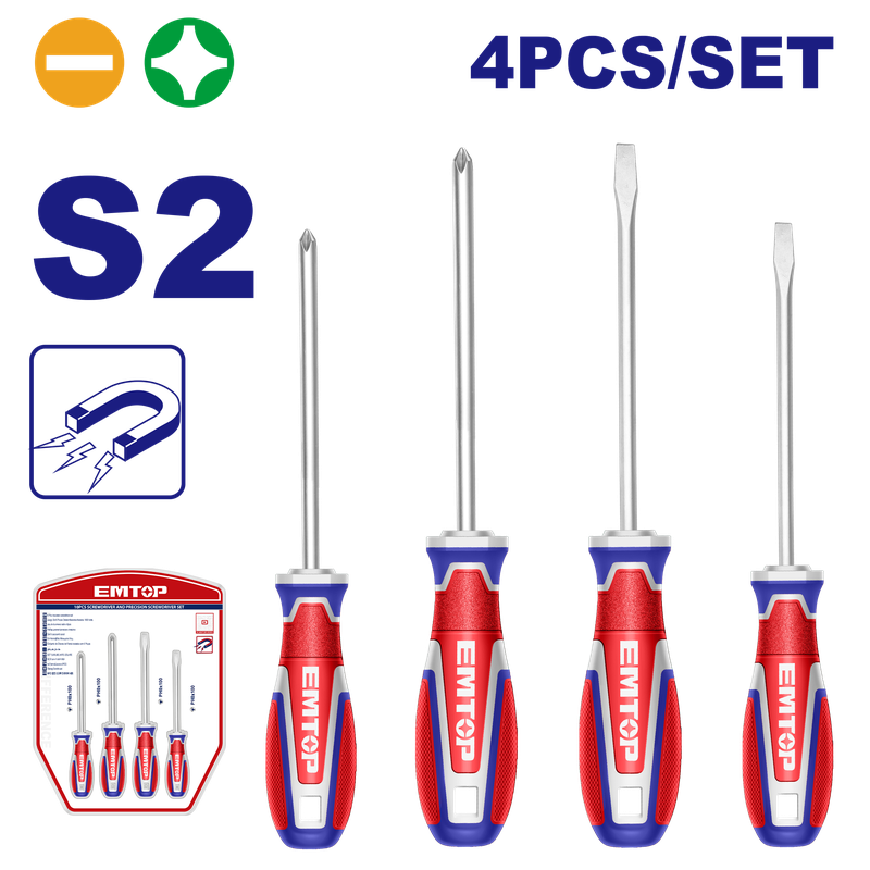 JUEGO 4 DESARMADORES MANGO ERGONOMICO 2 PLANOS Y 2 PHILLIPS PUNTA MAGNETICA. EMTOP