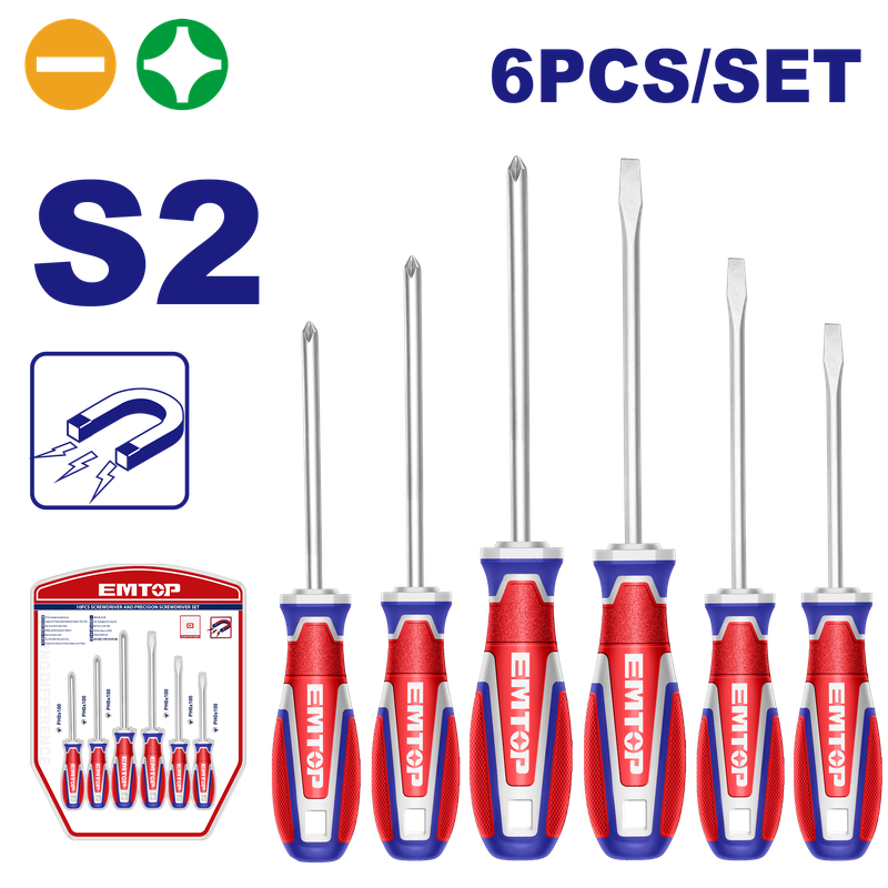 JUEGO DE 6 DESARMADORES 3 PHILLIPS Y 3 PLANOS PUNTA MAGNETICA. EMTOP