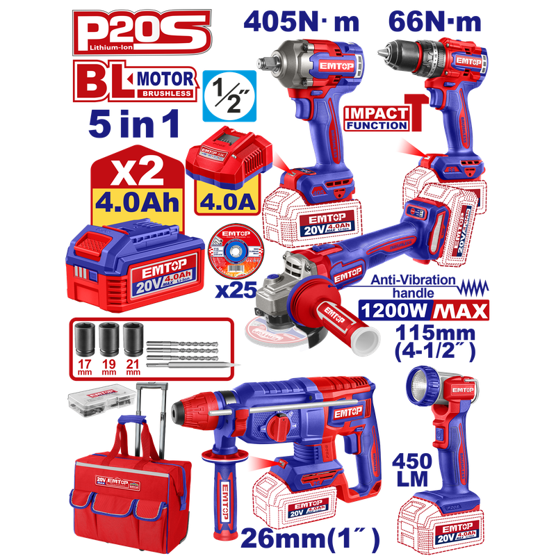 Kit de 5 herramientas inalámbricas de 20 voltios, Emtop, ULCKL2059