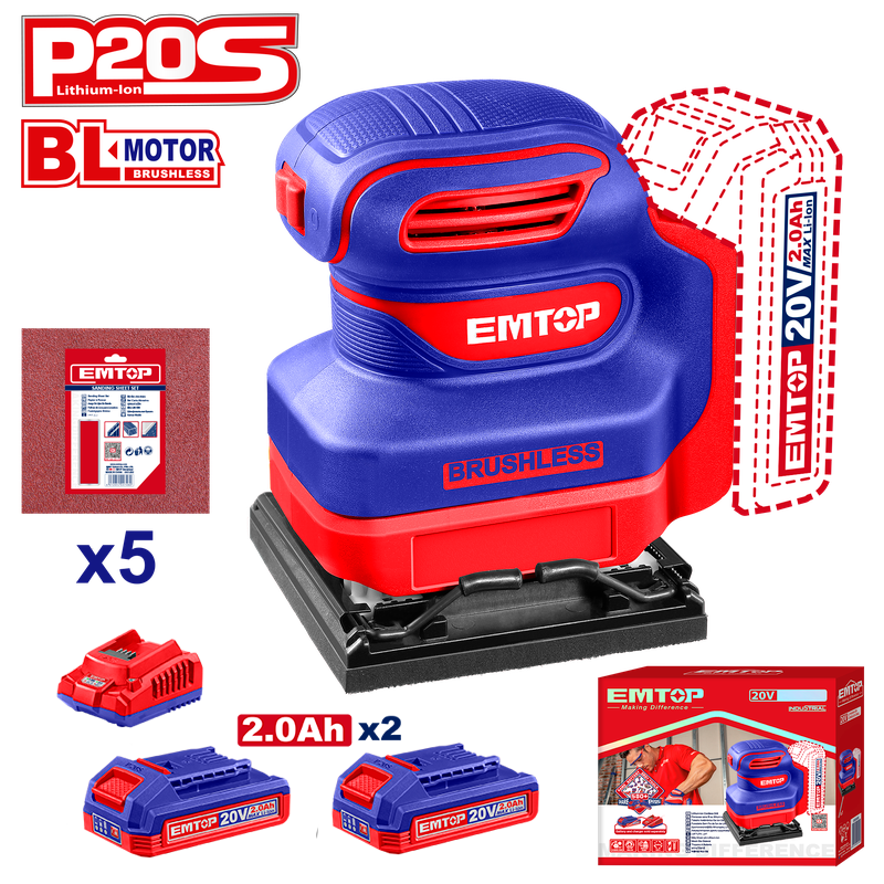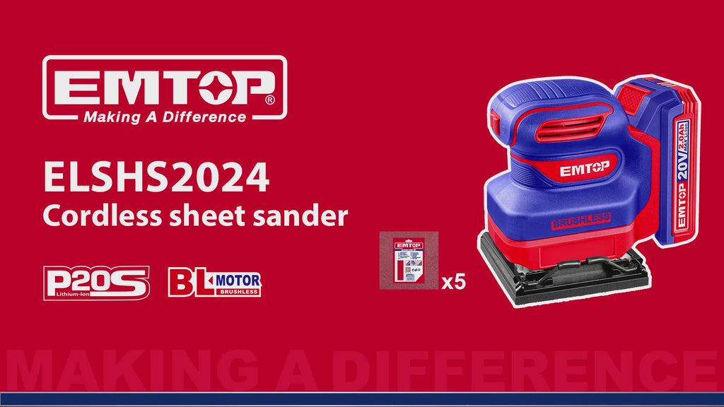 Lijadora orbital de 1/4 de hoja inalámbrica de 20 voltios, Emtop, ELSHS2024