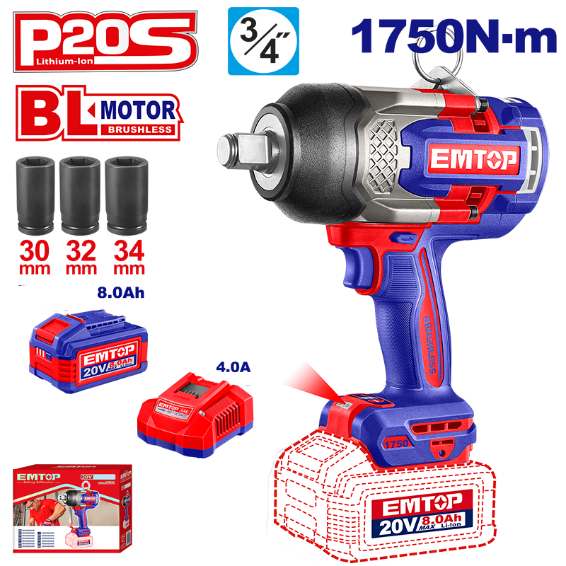 La llave de impacto inalámbrica Emtop ECIWL201751 de 3/4 pulgadas ofrece un torque máximo a la izquierda de 2100 Nm, ideal para el trabajo industrial y especialmente diseñada para aplicaciones en camiones. Su funcionamiento sin carbones garantiza mayor durabilidad y menor mantenimiento, mientras que la batería incluida proporciona mayor duración de carga y eficiencia en el trabajo. Esta herramienta combina potencia y confiabilidad para tareas exigentes en entornos profesionales.
