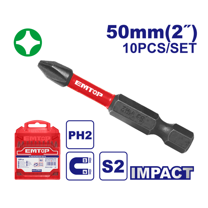 SET 10 PUNTAS DE IMPACTO PHILLIPS NO.2 X 2 PULGADAS DE LARGO PUNTA MAGNETICA. EMTOP