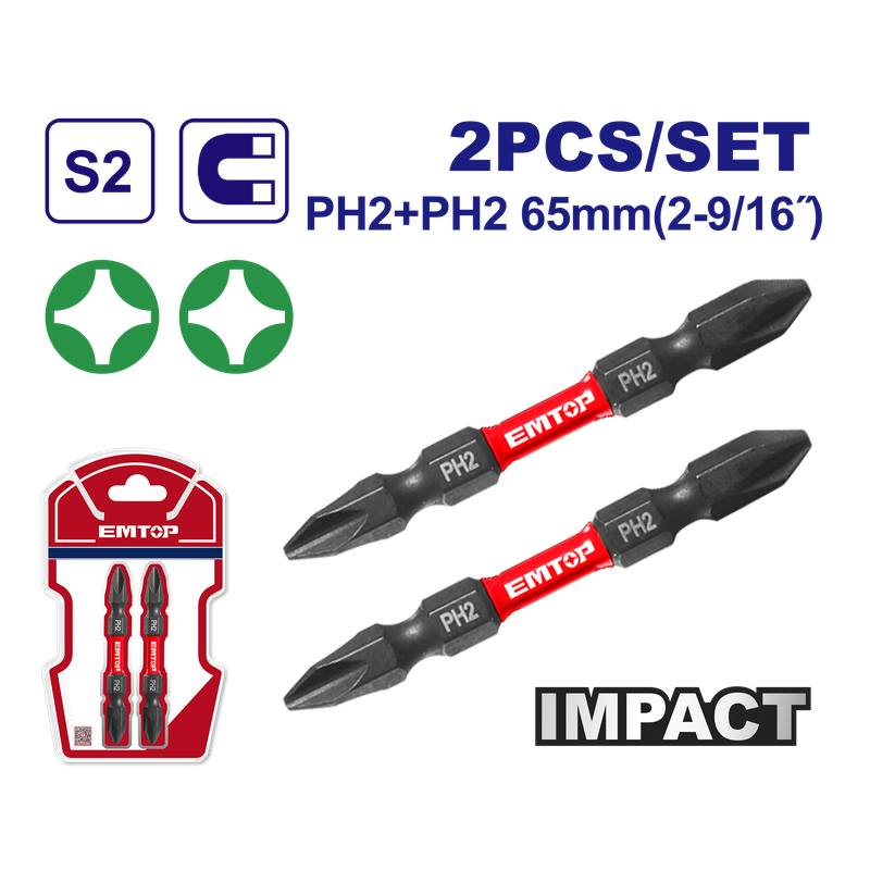 SET DE 2 PUNTAS DE IMPACTO DOBLES NO. 2 DE 2-9/16 PULGADAS DE LARGO. MARCA EMTOP